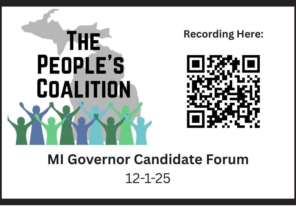 The People’s Coalition hosted several candidate forums for key important races, including Michigan Attorney General, Secretary of State, and Governor races. We asked many important questions, from fighting fascism, to protecting free speech, to addressing criminal justice reform, to protecting voting rights, and protecting our marginalized communities. We believe it is critical that our current and future electeds address the needs of marginalized people and groups, especially being impacted by state and federal action. Links to video recordings are below.